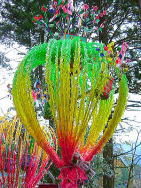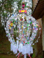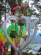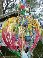 | 境内に奉納された花 | 花が御神幸の先駆を努めます。 | 笠鉾が御御輿の代わりです。 |