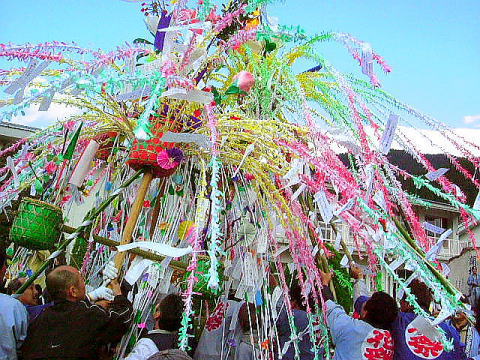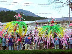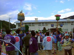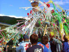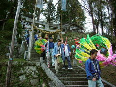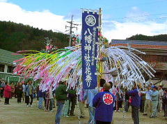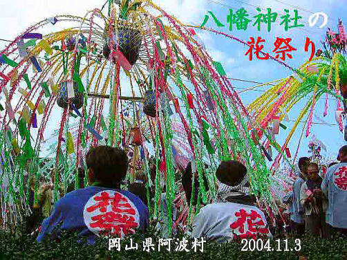 | 鳥取県と境を接する岡山県で一番小さい村、阿波村は、1,000m級の山々の懐に抱かれ、 380から600mの間に集落のある高地。村の94%を森林が占め、正に自然の宝庫です。 この阿波村の八幡神社の例祭に氏子から8本の花とよばれる だしが奉納され、花練り合戦という珍しい行事があるのでやって参りました。 だしの花は長さ2.7mの親竹の先端に花の芯となる台をつけ、麦藁を詰めた籠にシオレ竹80本を柳のように垂らし、 造花や百人一首などを書いた短冊で綺麗に飾り付けしています。 午後1時頃から花浄めや御分霊を笠鉾に移す神事が行なわれた後、お旅所までの御神幸となります。 御旅所は200mほど離れた一の鳥居の前です。 お旅所から還御の際、小学校のグランドで勇壮な花練り合戦が行われます。 花の芯を牛が角を突き合わせて争うように、勢いをつけぐるぐる旋回します。 約12分ほどでシオレ竹が全部落ちてしまいました。 見物人は落ちたシオレ竹や造花を先を争って拾いました。持ち帰って神棚に供えるとお蔭があり、 屋根の上に投げておくと火災よけになると言われています。 秋色たけなわ、人口約700人の阿波村のお祭りに人々は感動して家路につきました。 |