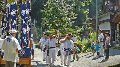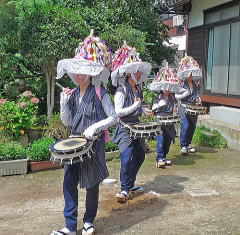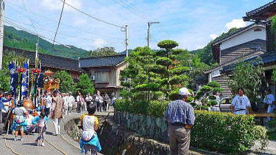 各家庭では庭先、縁先を開放して行列の一行を迎えます。 飲み物、菓子など心づくしの御もてなしに心が和み、 秋祭りのムードは、美しい自然と共に 村民の優しさに包まれます。 |