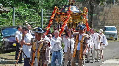 | 御輿は中高年の方が担いで山車の後に続いて 神輿渡御の役を担います。 |