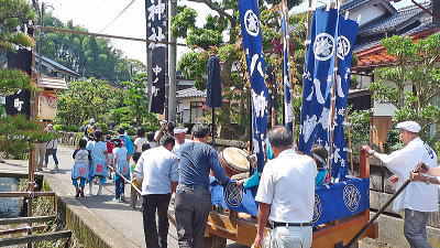 続いて鉾や太鼓、社名の幟を立てた山車は子供たちが綱を引いて います。 |