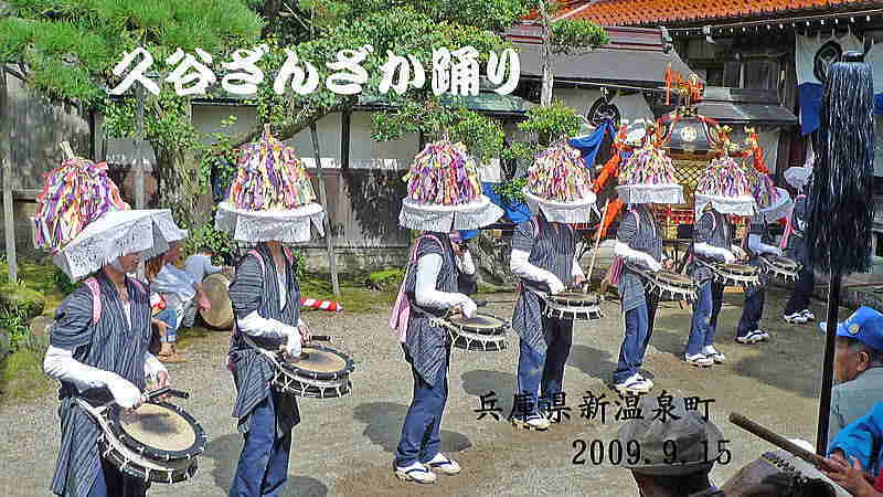 ここは、鳥取市と県境を接する但馬地方兵庫県新温泉町(旧浜坂町)久谷区、三方山に囲まれ 戸数約60戸、人口約300人の美しい自然の農村地帯です。 9月15日の久谷八幡神社の例祭の日にツァーでやって参りました。 同神社は「久斗の庄の一の宮」とも呼ばれる由緒ある神社です。 …秋の例祭に奉納される「ざんざか踊り」は別名「太鼓踊」と呼ばれ 伝承や歌詞から室町時代末ごろまでに成立したものと考えられており、但馬地方に残る ざんざか踊りの中でも古い形態が伝えられている。(町案内板参照)… この日、神社で「五穀豊穣」「氏子安全」を祈願して中高生8人が踊りを奉納したあと 二組に分かれ、また神輿渡御に合流したりして各戸の庭先で踊り氏神の祭りを祝います。 中世の風流を伝える衣装。下駄を履いているので、緩やかな調子で踊ります。 神輿渡御は、若者の担ぐ「榊」の神輿を先頭に子供たちが綱を引く太鼓や鉾、社名の幟を 立てた山車、中高年の担ぐ神輿が地区内各戸を回ります。 各家庭では行列の一行や踊り手を迎えて飲み物やお菓子など心づくしの おもてなしをして祭りを祝います。 地区内あちこちでひろがる日本の心の原風景に私たち旅人も心が和みます。 |