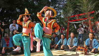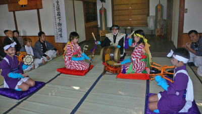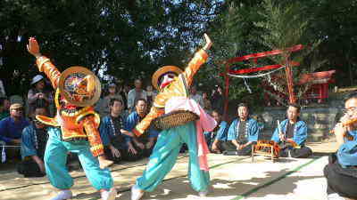 牛窓神社の末社、紺浦の疫神社では午後1時20分頃から少年2人による「唐子踊」が奉納されました。 朝鮮風の衣裳に唐人笠、保存会員のカンコや横笛の囃子や歌に合わせて独特の踊をします。 歌の文句は日本語も出てきますが、意味の解らない部分が多いということです。2回踊って20分ほどでした。 この踊子達は、後3ヶ所で唐子踊を奉納しますが、地に足をつけないように保存会の人の肩車かだんじりに乗って移動します。 朝鮮との長い交流を通じた生まれた芸能として、朝鮮通信使の番組とか記事に唐子踊の写真がたびたび登場しています。 従って、いつまでも伝承していくのに大きな意義があると思います。 |