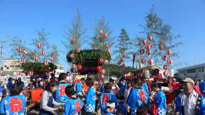 左上は中浦だんじり、右上は西町太鼓台。 左下は、港の海岸通りを練り歩く関町だんじり。男衆は女の長襦袢にお化粧をして花やいだ雰囲気です。 右下は、町の中心部に船形だんじり5台と太鼓台2台が集まって来るところ。 |