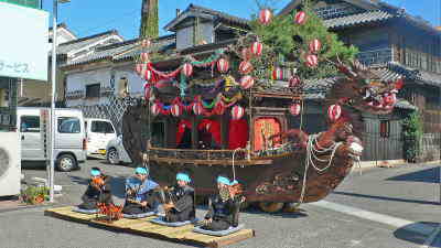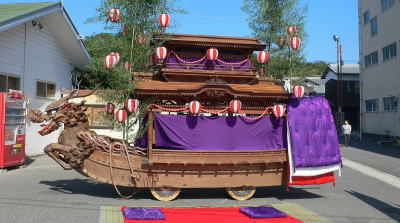 瀬戸内市牛窓町には牛窓神社の氏子地区に5台, 鹿忍神社氏子には3台の船形だんじり計8台がありますが 鹿忍神社のは、このお祭りには登場しません。 いずれも県の重要有形民俗文化財に指定されています。 長さは6m。二層の屋形をのせて舳先に龍、麒麟など、全体にも 様々な彫刻を施した豪華なだんじりです。 写真の関町のだんじりは、龍頭、総欅作り、 江戸時代の弘化2年(1845)の作で 彫刻技術の粋を凝らした牛窓だんじりの中でも とりわけ華やかなものとされています。 |