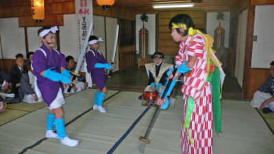 牛窓神社の末社、綾浦の御霊社では午前9時から少年5人によって伝統の太刀踊が奉納されました。 少年のうち1人は陣笠に裃、うち2人は女装の腰元風、残り2人は奴風の扮装。 左上は「ならし」と呼ばれるはやし。脇にいる保存会員の横笛に合わせて大太鼓、カンコ(小太鼓)、鉦と鼓ではやします。 右上は「太刀踊」保存会員の歌(異国風で意味不明ということです)に合わせて 祭り用具の刀と薙刀で「ヘイ・ヘーイ」と掛け声を出しながら、歌舞伎の立ち回りに似た踊りをします。 由来は神宮皇后をお慰めするために踊ったという説もあり定かではありません。 踊りは拝殿での後、境内でも1回踊り9時半頃終われました。少年達の真摯な演技に引き込まれた30分でした。 岡山藩の池田家の文書にも記載があり、古くから行われていたと説明板にあります。 |