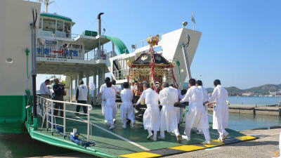 神輿は、午後0時15分の便で沖合いに浮かぶ周囲約10キロの 前島へ巡行のため 関町の乗り場からフェリーに乗船、海上5分の渡御です。 |