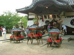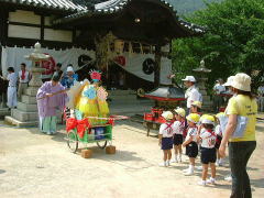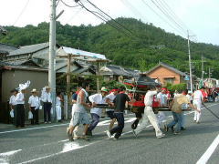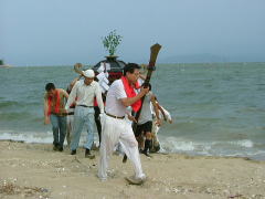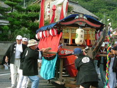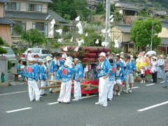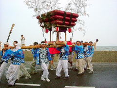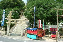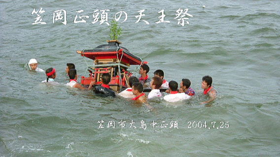 岡山県笠岡市大島中正頭の氏神、素盞鳴神社の夏祭り、漁村に残る伝統行事の ”天王祭”が7月25日地区民挙げて勇壮に行われました。 厄除けの神、牛頭天王は、素盞鳴尊と同神と言う説もありますが、祇園祭りとか天王祭りは祇園信仰に 由来するものと言えましょう。 午後2時ごろから社殿にて疫病退散、海上安全など祈願した後、800m離れた御旅所、 日留子(ひるこ)大神(祭神は海の神様恵比寿様)へと向かいます。 氏子達の行列は1太鼓、槍、神輿の担ぎ手、神職、船神輿、千歳楽、保育園児の山車と続き 海岸沿いの県道をゆっくりと進みます。 日留子大神で祈願の後、帰りには、ここに安置してあった神輿が登場し、祭りが一気に盛り上がってきます。 鉾を持った神輿のリーダーの合図で、神輿が暴れる獅子のように走り回ります。 途中のもう一つの御旅所や金刀比羅宮の祠の前など数ヶ所で勇壮に演じられました。 そして素盞鳴神社鳥居前まで帰るといよいよ満潮の海に入る祭りのクライマックスを迎えます。 千歳楽も激しい練を繰り返して、これに呼応します。 |