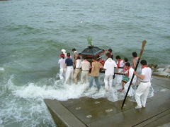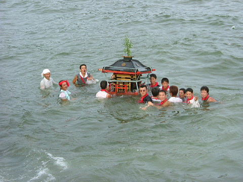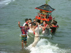 午後5時ごろに素盞鳴神社の鳥居前まで帰って来ました。いよいよ祭りのクライマックスを迎えます。 勢いをつけて満潮の海へ入っていきます。少し波が出てきましたが怯まず進みます。 足が浮くようになるが沈みそうになる神輿を支える。力強い海の男達の勇ましい行動が、 多勢の観客の前で堂々と三度も行われました。 昔は、神輿が3臺も出たそうです。 |