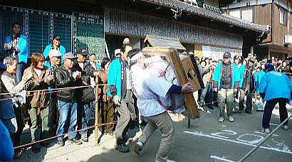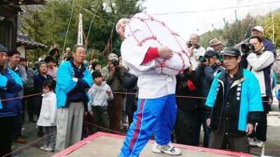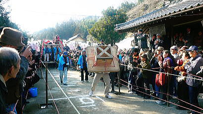 午後1時から五大力明王の祈願を受けた力士(参加者)の登場です。 放送で14歳から69歳まで26名の幅広い年齢層です。 五大力餅重量大きさは次のとおり。 上餅 直径80センチ 重量 53キロ 下餅 直径90センチ 重量 81キロ 大三宝 1メートル四方 48キロ ロープ及び布 3キロ 総重量 計 185キロ スタート地点で数人の世話役の人の助けを借りて胸まで持ち上て、 反対に向きを変え一歩一歩前進する競技ですが、スタート地点で 185キロの重量に耐え切れず投げ出す力士も続出しましたが、 挑戦するその意気や壮とすべきで五大力明王のご利益もあろうかと 考えられました。 結局下の写真の方が19.45メートル運び見事優勝されました。 声援と拍手で境内は沸きに沸きました。 (昨年の優勝は17.55メートル) |