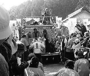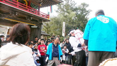 大鏡餅は上餅と下餅とありますが、子供の部は重さ53キロの上餅を持ち上げて いつまで持ち堪えられるかその持続時間を競う力比べです。 小学1〜6年生50名ほどの元気一杯の少年少女の参加で行われました。 親達や参拝人の声援の飛ぶなか優勝は小学5年生男子のの3分22秒でした。 |