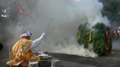 五大力明王堂で祈願をした山伏達による柴灯護摩我行われ、願い文奏上、法弓、法剣などの儀式に続いて 護摩壇に火が点けられます。 勢い良く燃え上がる白煙が辺りを包み、唱える般若心経、錫杖のリズム、投ぜられる祈願を込めた護摩木、 真言密教の秘法に神秘を感じます。 |