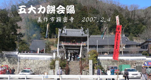 美作市尾谷にある西成田返照院・顕密寺では 毎年2月の第一日曜日にこの寺におまつりしている 五大力明王の威力にあやかって力自慢を競う 伝統行事が行われます。 寺伝によれば、後鳥羽上皇が承久の変(1221)に 敗れて隠岐に流される途中,この寺に立ち寄られた際 近郷の農民がもち米を持ち寄って大きな重ね餅を献上 したとの故事に由来したと伝えられたとあります。 五大力餅の功徳が書かれていましたが、 昔から五大力餅会陽(五大力明王)に参拝すると 「福智の力」が授かると同時に「除厄」になるという 言い伝えがあり 参拝の人々は、寺の玄関に置かれた 餅にさわり、厄をはらう仕草や祈願の申し込みを していました。 |