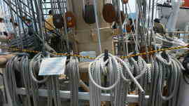 ファイフレール マストの下にあります。帆を広げる沢山の ロープが並んでいます。 風で孕んだセールを支える強力な 真鍮製のピンがついています。 滑車も様々です。 |