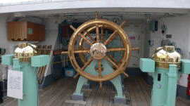 舵 輪 良好な帆走にするための舵輪、船尾にあります。 大時化ののときは4人がかりで操作するため 前後の二重になっています。 1回転で1度舵が傾くとあります。 |