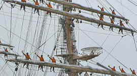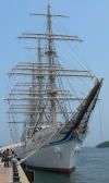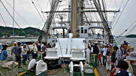 5月19日、「海王丸」と別れる日が来ました。午後2時前船長さんらが降りてきて歓送の保育園児たちに「この船には皆さんのおじさんやお姉さん達が 実習生として乗っています。皆さんも大きくなったらこの船にも乗ってください」とやさしく挨拶され園児達に記念品を贈呈されました。 園児達はこれに応えて一生懸命に楽隊の演奏しました。別れというより晴れの門出という曲調です。 いよいよ帆船の最高儀礼が[登檣礼」が始まりました。 実習生は各ヤード(帆桁)の下のフートロープや、船首から突き出ている棒状のバウスプリットにも配列します。 職員は舷側に整然と並ぶ登舷礼の配置です。 バウスブリットノ先端に立つ実習生の合図で脱帽、「ごきげんよう」の号令に会わせ全員で「ごきげんようー」と発声して右手で帽子を振り上げます。 これを3回行います。見事に全員一斉に揃って爽快です。海洋に雄飛せんとする若人の大音声が宇野港にこだまし、 歓送の人々は拍手で答え、それぞれの胸を熱くする感動のシーンです。 やがて海王丸は岸壁を離れ静かに沖へとその美しい姿が遠ざかっていきます。甲板に降りた実習生や職員がいつまでも帽振れしています。 7月にはハワイへの遠洋航海があるそうです。 |