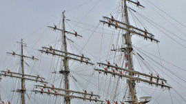 17日午後1時からセイルドリルが始まりました、実習生らは裸足で縄梯子を伝わって登り、前3本のマストの各ヤード(帆桁)のロープを解きます。 足場はヤード下のフートロープです。 マストの水面からの高さは、前から順番にフォアマスト53m、メインマスト55m、ミズンマスト54m、ジガーマスト47mで、 後方傾斜角度はフォアマスト3.5度、メインマストで4.0度、ミズンマスト5度、後方のジガーマストで5.5度となっています。 前方のマストには横帆を張り、一番後方のマストには縦帆を張るのがバーク型帆船といわれ、海王丸は4檣バーク型帆船と説明板にありました。 各ヤードでの作業を終えた実習生らは下に降りて合図と掛け声でロープ操作で帆を降ろします。全36枚、総面積2,760uの大きさです。 風も無く約1時間で終了しました。 |