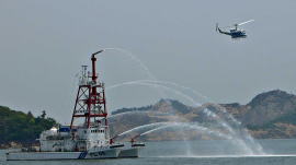 18日、水島海上保安部所属の大型消防船「すいりゅう」の放水です。全長27.5mの双胴船です。 放水銃のいろんな角度からの放水で消火活動が想像出来ます。海上保安庁のヘリコプターも飛来してきて上空を数回旋回する見せ場もありました。 |